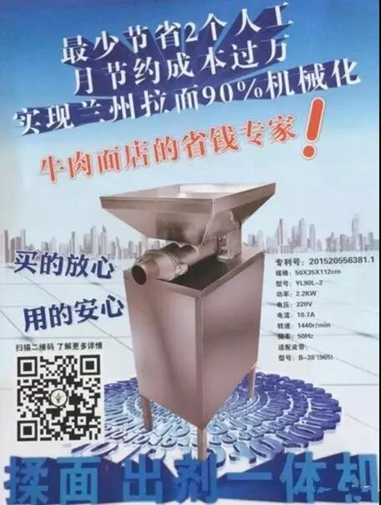 近年來(lái),蘭州牛肉面產(chǎn)業(yè)化發(fā)展被提上了日程,備受矚目。然而,產(chǎn)業(yè)化發(fā)展,必須實(shí)現(xiàn)機(jī)械化。正當(dāng)牛肉面人為之發(fā)愁的時(shí)候,興隴牛肉拉面廚房設(shè)備有限公司率先邁出了第一步,研究發(fā)明出了“興隴”揉面出劑一體機(jī),這是蘭州拉面史上一次全新的嘗試與改革,將極大推動(dòng)蘭州牛肉面的發(fā)展。